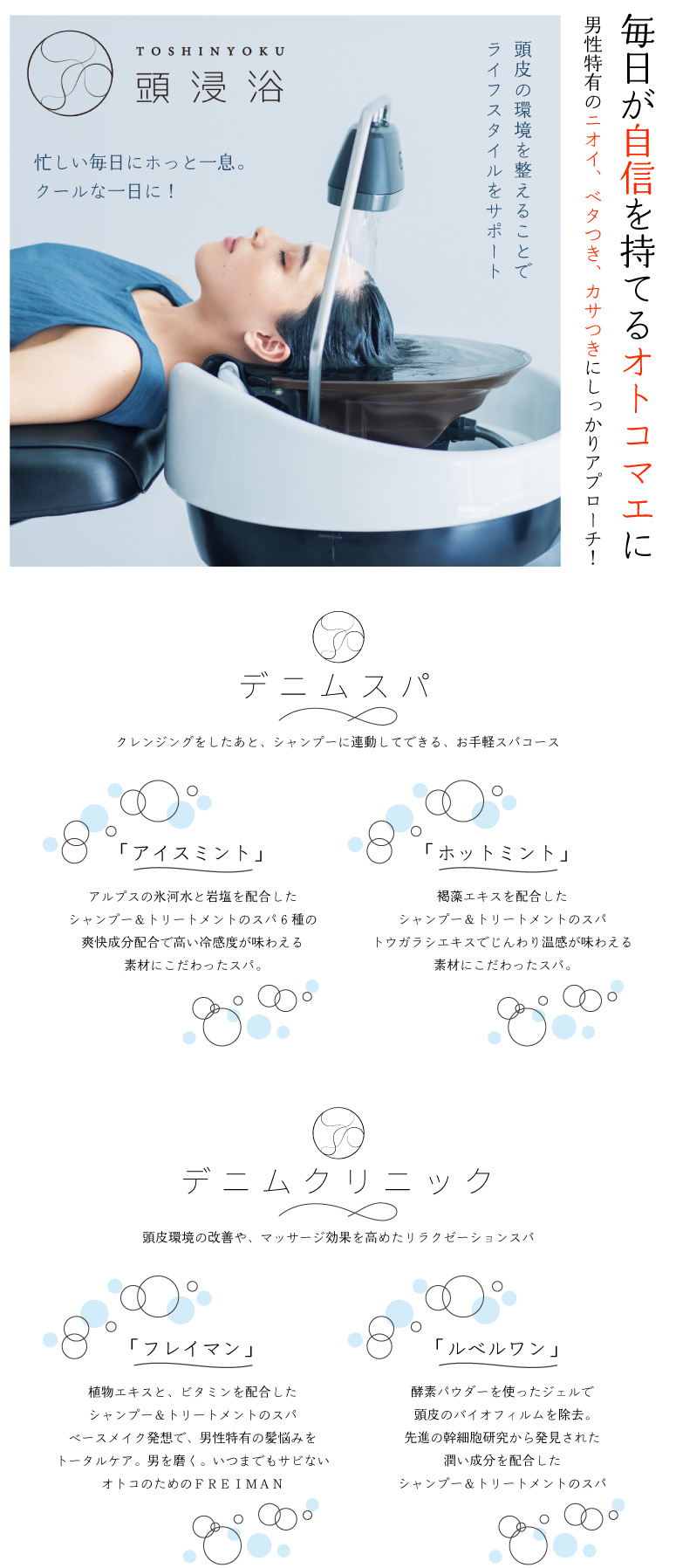 普通のスタイルに飽きた方、こだわりを持っている方へ。 デニムでは男のカッコイイ、なりたい自分を追求しております。十人十色の髪質や毛量、頭の形などを充分考慮し、 基本に忠実に、さらに流行を取り入れたカットで、あなたを「オトコマエ」にいたします。 また、デニムでは、カットメニューに加えて様々なリラクゼーションメニューもご用意しております。 特におすすめの「頭皮クリニック」は、頭皮だけでなく、頭の中まで爽快感が味わえ、 これまでにない贅沢なひとときをお過ごしいただけます。
